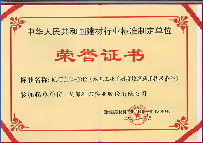 我公司榮獲“中華人民共和國建材行業(yè)標準制定單位榮譽證書”、常務副總經(jīng)理徐智平先生獲得“JCT2104-2012《水泥工業(yè)用耐磨堆焊通用技術條件》行業(yè)標準起草人榮譽證書”、項目經(jīng)理鄧四文先生被評為2012年度建材機械行業(yè)標準化先進工作者。
